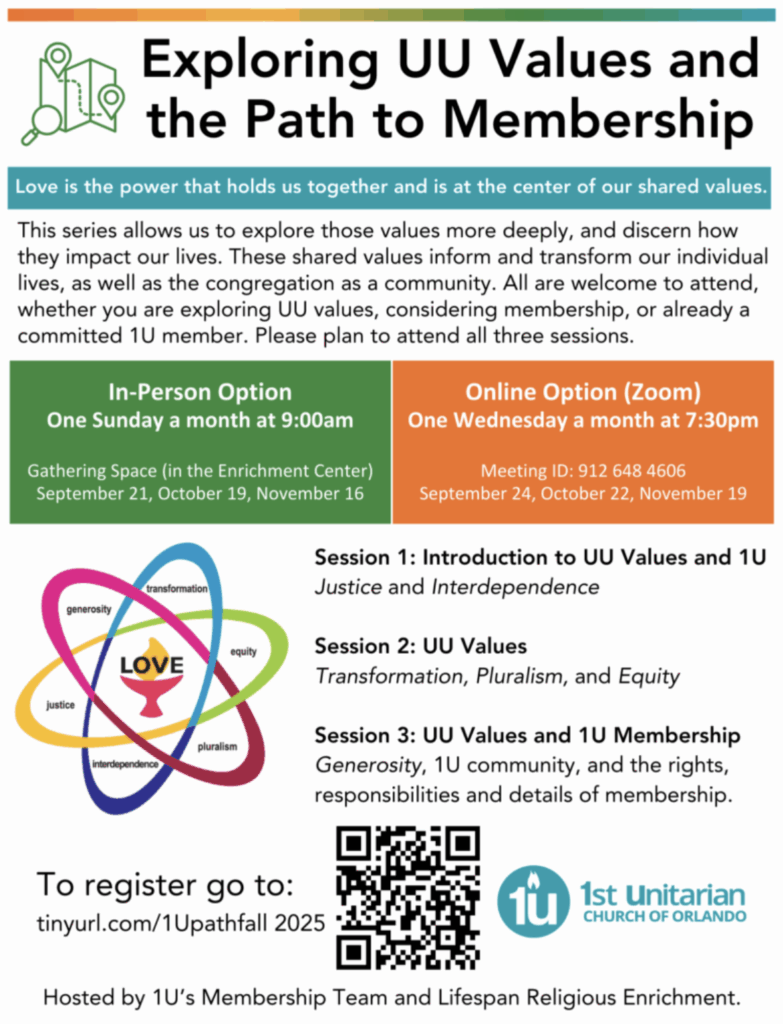 We ask those feeling ready to commit to membership to make sure that they understand the basics of both Unitarian Universalism and First Unitarian. One way to do this is to attend our Path to Membership Series, which we offer twice a year, in the spring and in the fall for those who are ready to investigate or/commit to officially becoming members at 1U. Details about the membership process are discussed in one of the sessions. Email us here for details, or register here.