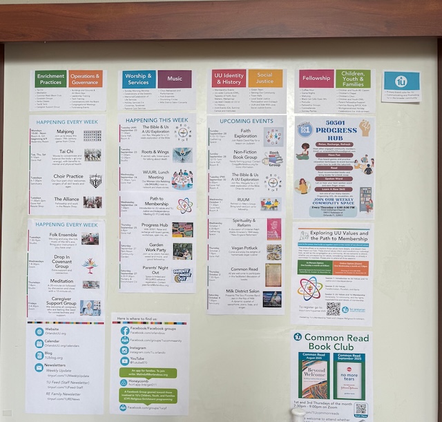 - Enjoy our many and diverse Religious Enrichment offerings and Fellowship activities. Details can be found on this website in the Events Calendar, in the Weekly Update, on the main bulletin board in the Gore Hall foyer [below], and on our Facebook page.