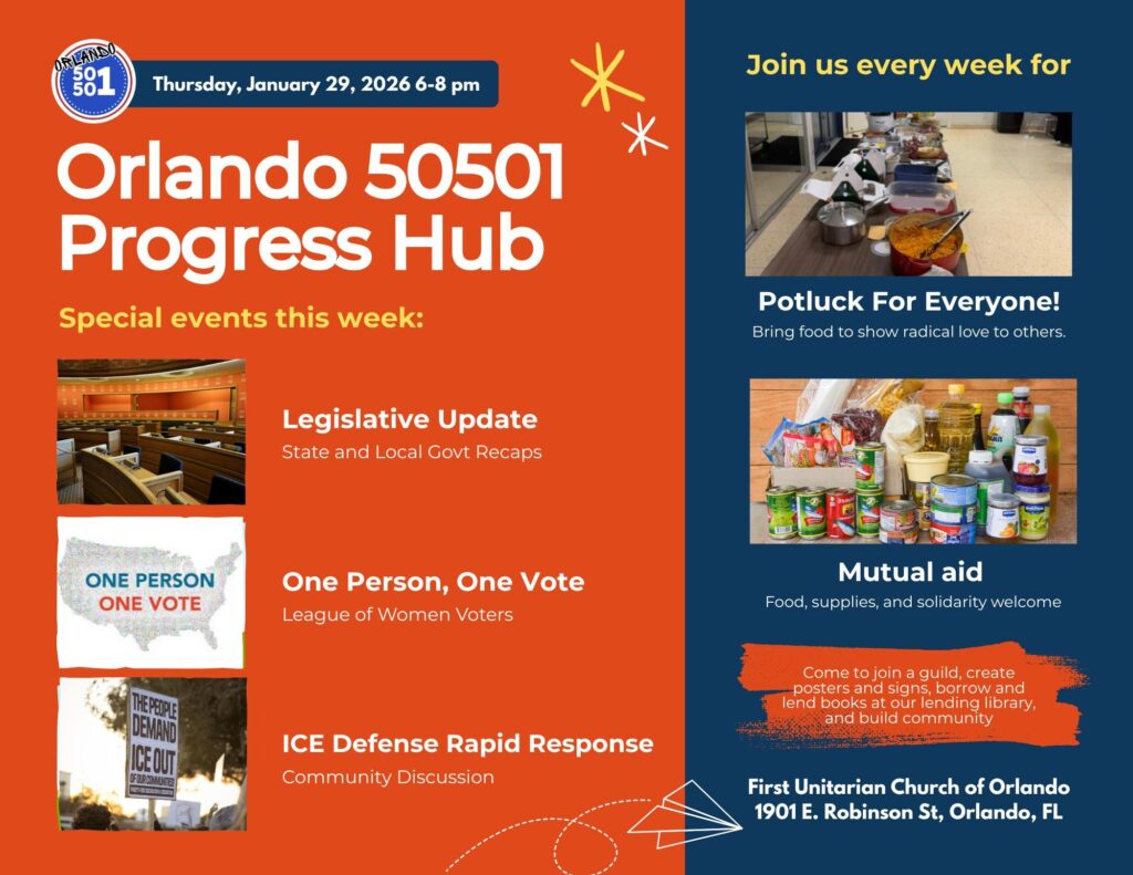 - COMMUNITY JUSTICE ACTION: 50501 Orlando’s Progress Hub Every Thursday night, 6-8pm | ICE Out of Orlando This Saturday, 12pm
